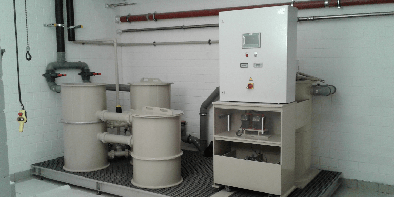 Unsere Anlagen arbeiten weitestgehend automatisch. Das heißt, aus einem bauseits vorhandenem Pufferbecken wird mittels Membranpumpe und jeweiliger Pegelsteuerung eine Charge in den Reaktorbehälter gepumpt. Unter Rühren und Zugabe des Flockungsmittels / Koagulants werden die vorhandenen Feststoffe gebunden und nach dem Rührvorgang (ca. 15 Minuten) sedimentiert. Über eine Trübemessung wird die Klarwasserphase mittels Kreiselpumpe und Steuerventilen entweder bei Trübung in den Schlammeindicker, oder über den Kiesfilter und pH-Endkontrolle (mit Ausdruck) in den Kanal gegeben. Die Schlammphase wird zur besseren Konditionierung in einen Schlammeindicker gepumpt und anschließend mittels Kammerfilterpresse entwässert.