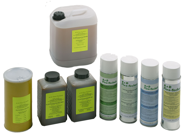 Verbrauchsmaterialien für die Magnetpulverprüfung: Öle, Additive und Pulver für optimale Prüfqualität und Gerätepflege.